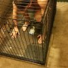 Nope! Not at all. He did seem to get used to this after a while, so I decided to give him more to “occupy” himself with. I unlocked one of the cage doors, reached in, and chained his tied balls to the top of the cage. I ran the chain so it was pretty taut and he had to either lift his ass up a bit or deal with stretched balls, his choice. I padlocked the chain to the top of the cage to keep it at that length.