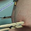 So Nebraska boy is still "hanging in there", no pun intended. His feet are hanging from the spreader bar, but with his nipples of steel that seem to be able to handle anything I throw at them, it was time to kick things up a notch. So I replaced the clover clamps with the velcro lined nipple clamps. Then I cranked the spreader bar up a bit higher, making it tougher to hold his legs in the position they were in without extending his legs out straight, which would then pull his balls and velcro-clamped nipples.