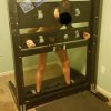So I started him out locked in the stocks. But just being locked in the stocks wouldn’t even be a 5 for any guy in decent shape. So after he was locked in, I unlocked the cock stocks and lowered the boards that locked his head and hands in to a level that forced him to bend over, to make him more “comfortable”. <grin> He still looked a bit too comfortable, so I decided to tie his balls leaving a loop at the end of the rope. This allowed me to use clips and carabiners to gradually shorten that rope by clipping it to an eyebolt at the bottom of the bondage wall…and that’s just what I did. As I shortened the rope, he had to squat down more and more, testing his endurance.