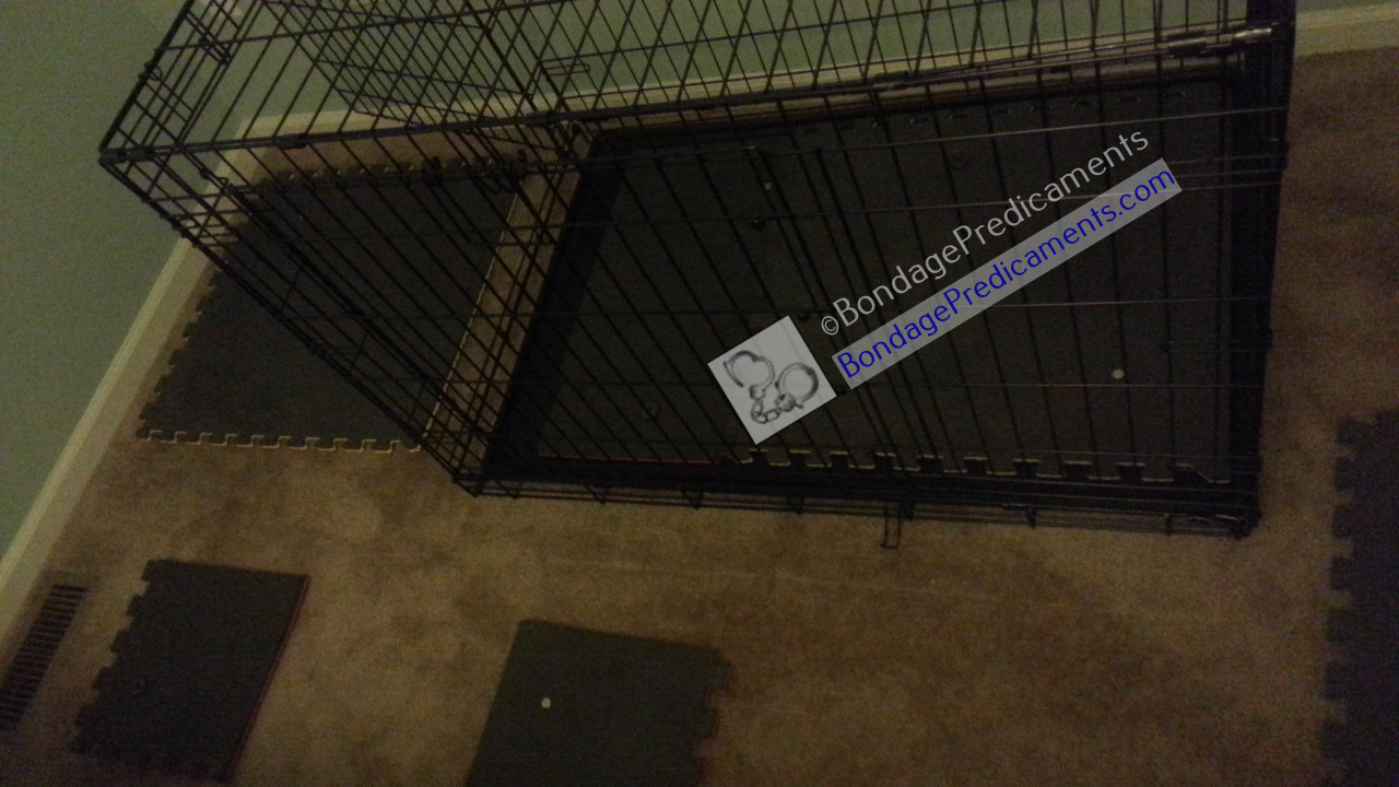 A while back when hushpuppy1980 visited, I came up with a few little games for him to play in the playroom. This was one of them. He brought some nice weighted nipple clamps with removable magnetic weights, so I had to put them to good use. I rearranged the playroom so the bed was in the middle, and there was space (to crawl) all around it. Then I scattered a bunch of magnets and some other metal objects around the room, including inside the cage.