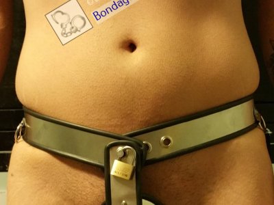 Mike put on the full chastity belt, then Jason secured padlocks at the top and bottom to lock everything in place.