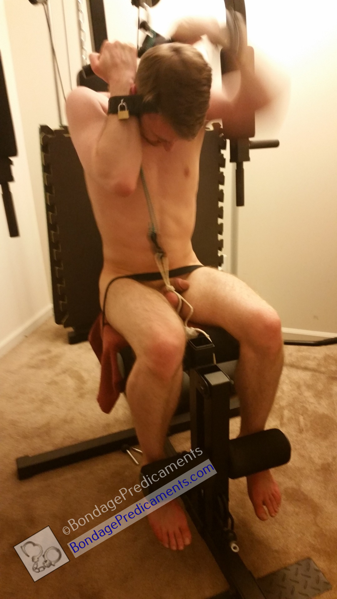 For just about every workout (wherever it was possible, while still keeping him safe), I used his balls as his motivation. I tied a rope around his balls with a loop tied off in the rope. Then I strategically hooked a bungee cord from his tied balls to whatever I was making him pull down/up/in, or wherever. He could only release the weights so far before it would start to stretch his balls…and he knew his balls wouldn’t be released until he completed the set. So it was in his best interest to crank out all the reps without getting lazy. Then he got a break after each set (with his balls released).
