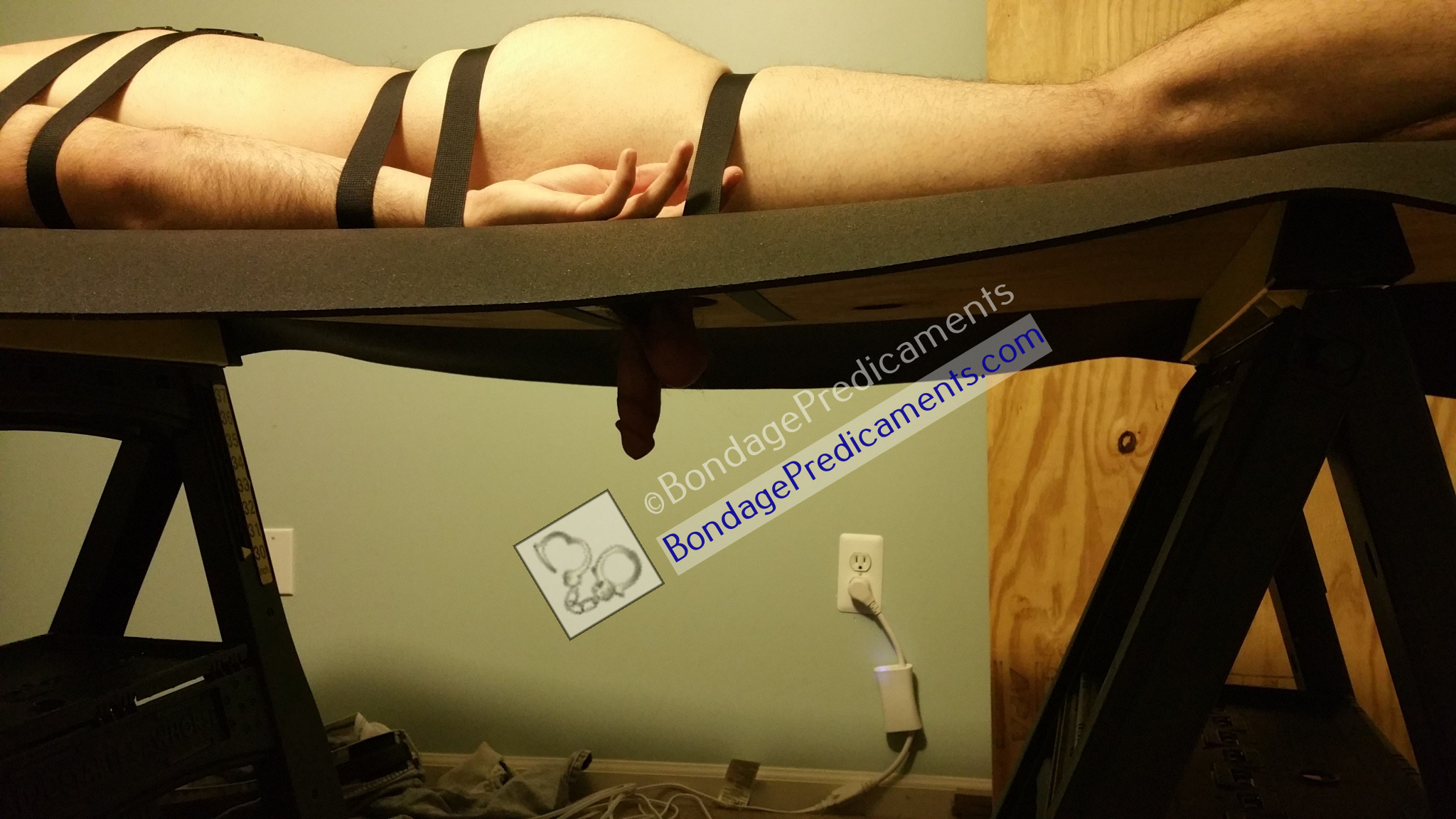 12. Have your sub lay on your new bondage table, facing down, arms at his sides, with his dick/balls pushed through the center hole. You can use a few additional utility straps to run around his chest and arms to keep them held together. Then use the remaining straps to strap him down to the bondage table. You won’t want him moving much for the relentless edging and cock teasing to come! ;)